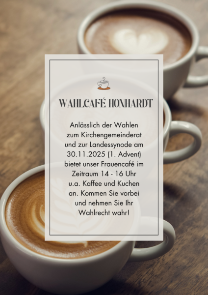 Für die Briefwahl sind nun auch Briefkästen am Ev. Gemeindehaus Honhardt (Schulstr. 4) und am Pfarrhaus in Honhardt (Hällische Str. 20) gekennzeichnet. Es kandidieren: Liane Ebert, Tobias Ehrmann, Uli Fornacon, Daniel Lebsanft, Klaus Schneider und Karin Schwarz. Die Wahlunterlagen (mit Briefwahlunterlagen) gehen ihnen persönlich zu. Sie können am 30.11.2025 auch im Zeitraum 10-17 Uhr im ev. Gemeindehaus vor Ort zum Wählen gehen. Es erwartet sie auch ein Wahlcafé, das vom Frauencafé organisiert wird.