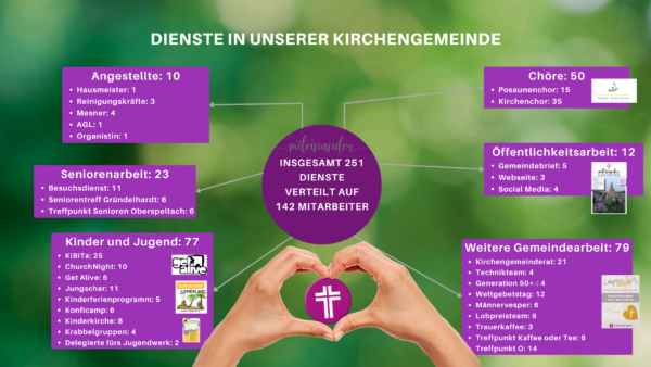 Wir sind unglaublich dankbar um jede und jeden einzelnen, der sich mit seinen Fähigkeiten in die Gemeinde einbringt. Das ist von 1.488 Gemeindegliedern immerhin fast jeder Zehnte. Das ist unglaublich wertvoll und die Grundlage dafür, dass unsere Kirchengemeinde gut in die Zukunft kommt, die sicher herausfordernd wird. Doch mit so vielen Menschen und mit Gottes Geist brauchen wir uns vor nichts zu fürchten.