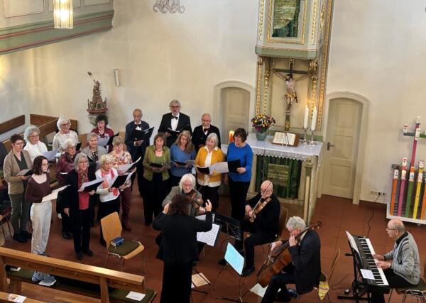 Dieses 90-jährige Jubiläum haben wir am Sonntag, dem 2. November 2025, in einem Festgottesdienst in der Peter-und-Paul-Kirche zu Honhardt gefeiert. Der Chor gestaltete diesen feierlichen Gottesdienst zusammen mit einem Streichquartett unter Leitung von Hanns-Hermann Lohrer und Juliana Hayer. Pfarrerin Hermann erinnerte in ihrer Begrüßung, ihrer schönen Predigt und im Gebet immer wieder an die Kraft des Singens. Auch der neue Dekan Andreas Arnold hob in seinem Grußwort die Bedeutung des Chorgesangs in der Kirche hervor.