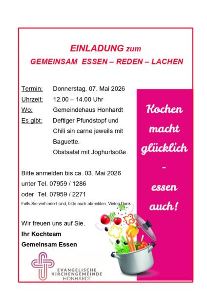 Am Freitag, den 24. April 2026 findet um 19.00 Uhr unser nächster Jugendgottesdienst (JuGo) unter dem Motto „Teens für Jesus“ After-Easter-Party mit Raclette im Gemeindehaus in Honhardt statt. Herzliche Einladung hierzu.